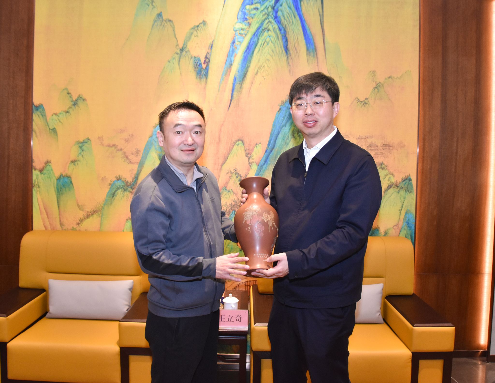 王立奇书记(右)代表酒泉市接受赠与