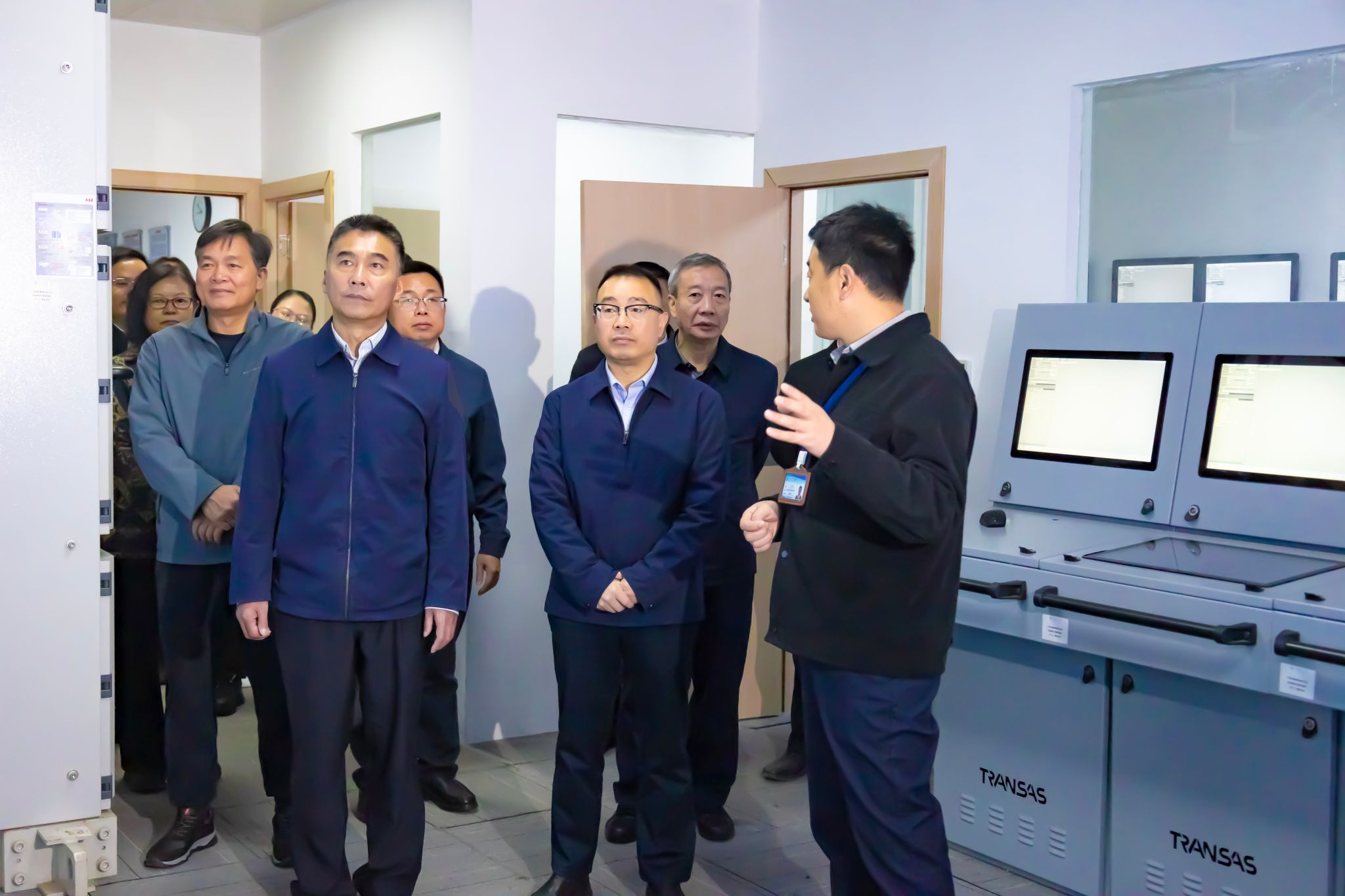 王乃学(右三)实地考察船舶动力与智能化焊接实验室建设情况,徐华蕊(左三)陪同