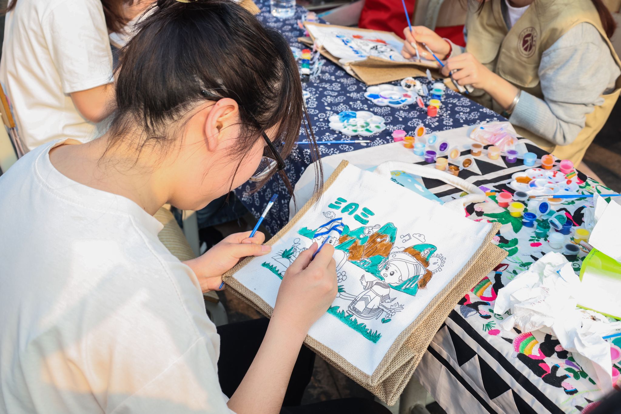 舞台之外,民俗体验区人声鼎沸。跳竹竿挑战“手脚并用”,师生随着节奏轻盈跃动;板鞋竞速赛上,三人一组默契冲刺,呐喊助威声此起彼伏;手工制作区里,竹编、漆扇、扎染、坭兴陶、绣球、香囊制作吸引大批“手工达人”。人文学院的王同学捧着手工绣球动情地说:“一针一线都是文化传承的密码!”更有知识问答、盲人击鼓等趣味项目,让参与者在游戏中读懂壮乡文化。