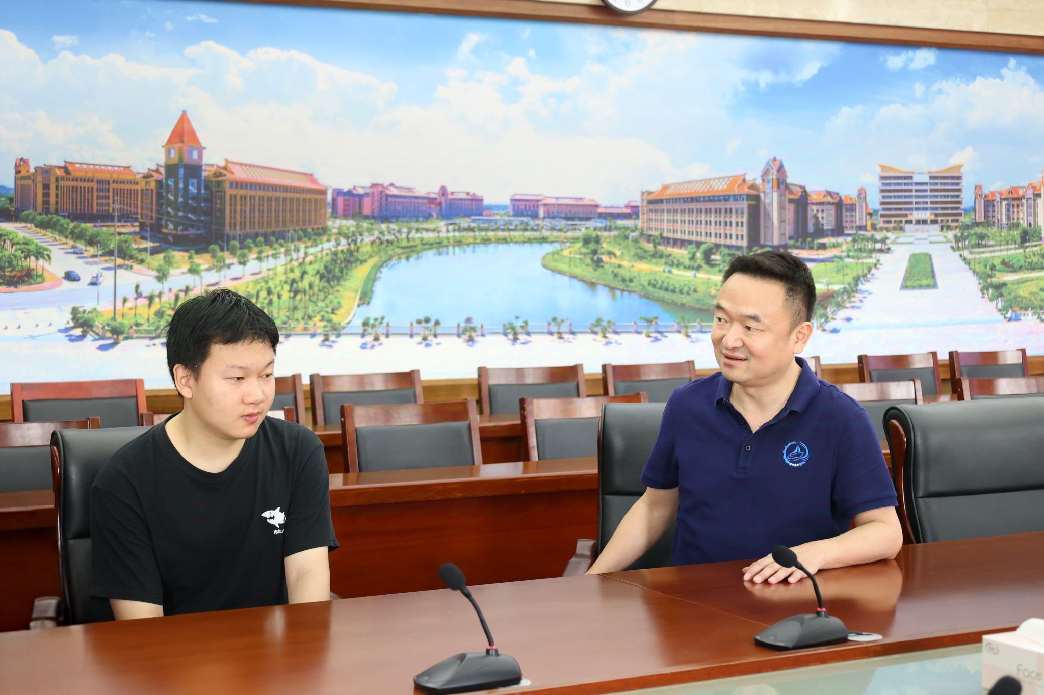 苗剑校长(右)与载誉归来的高龙峰同学(左)亲切交谈