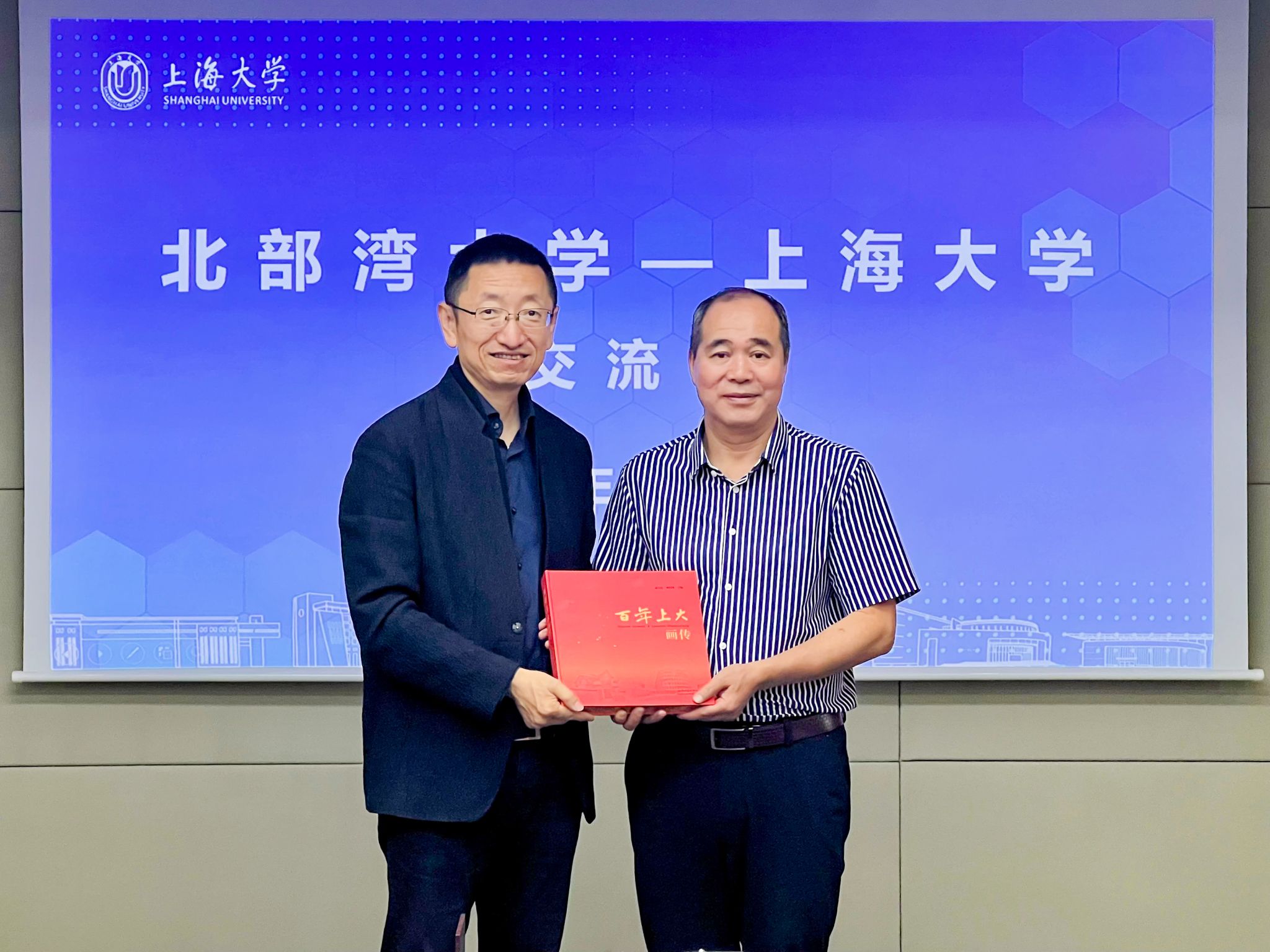 上海大学苟燕楠(左)向必威西汉姆联赠送百年上大画册,唐高华(右)代表学校接受赠予