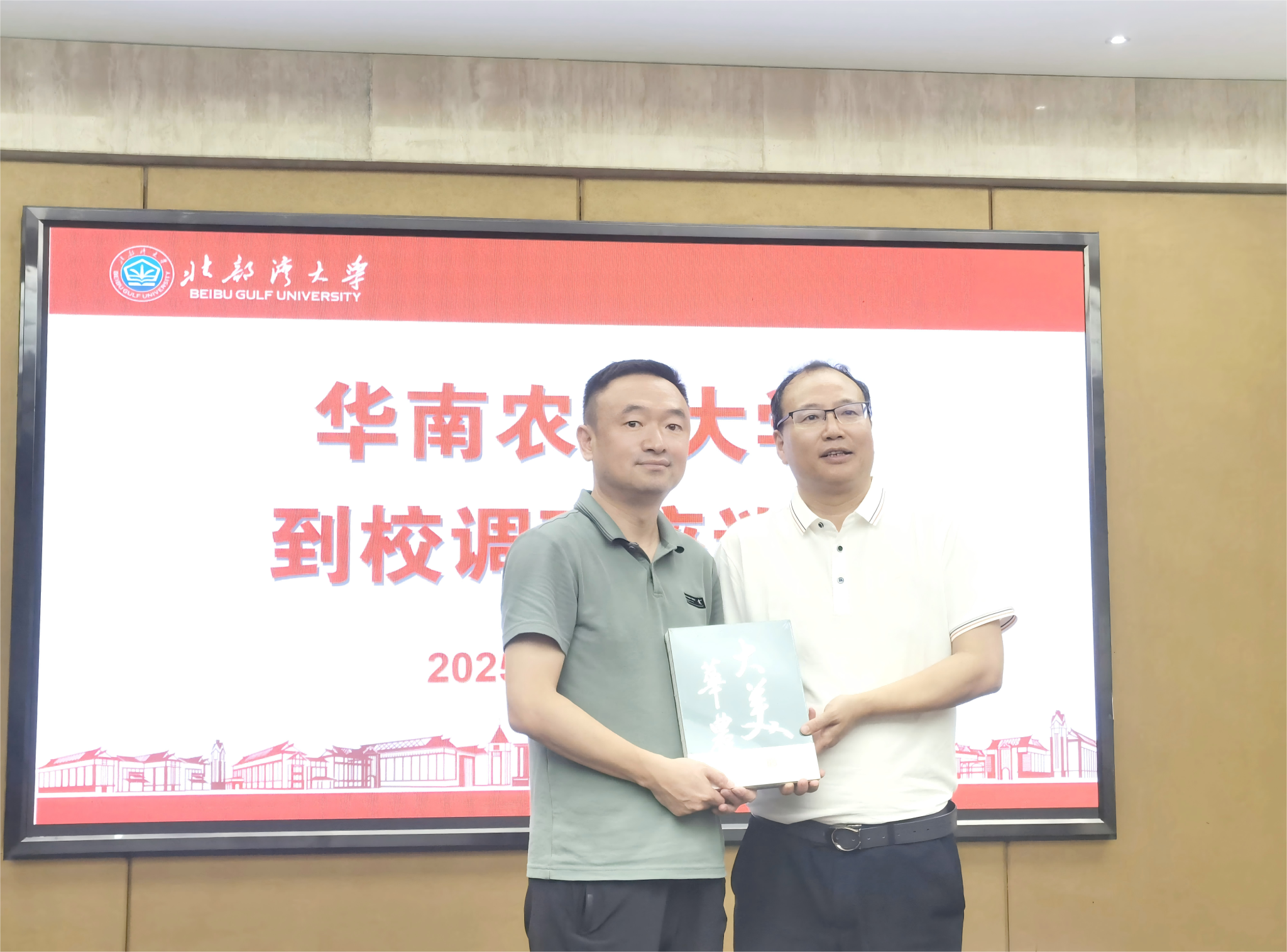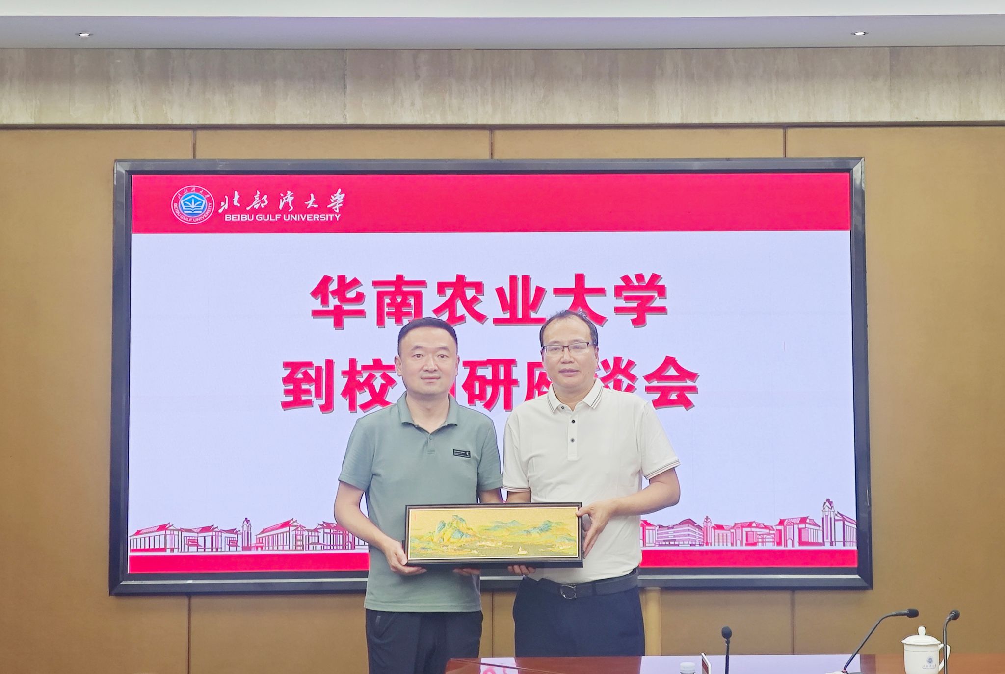 丁红星(左)代表华南农业大学向必威西汉姆联赠送华农校庆纪念品,苗剑(右)代表学校接受赠予