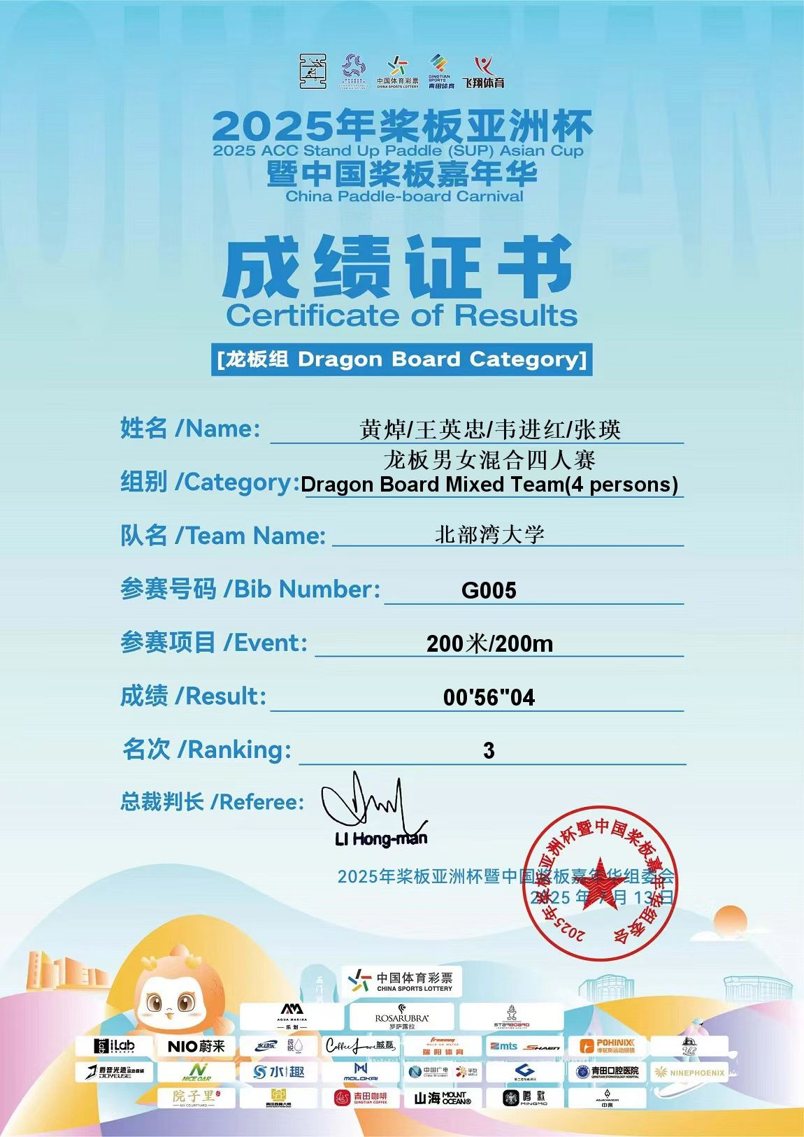 7月13日,2025年亚洲杯国际桨板赛在浙江青田圆满落幕。经过激烈角逐,由黄焯、王英忠、韦进红、张瑛四名学生组成的必威西汉姆联代表队在200米龙板男女混合四人赛中斩获铜牌。这是学校桨板队首次获得国际级比赛奖项。