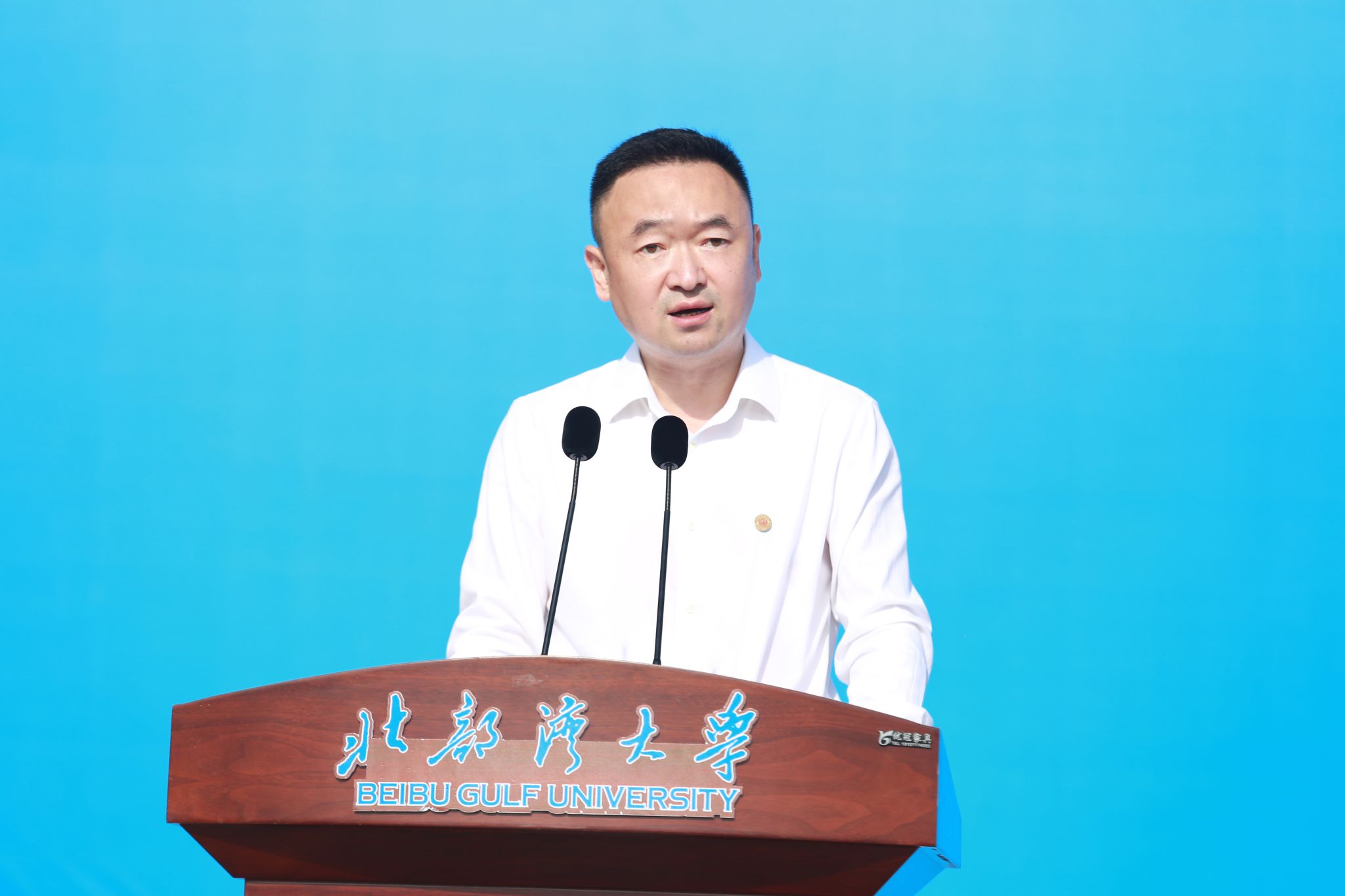 校党委副书记、校长苗剑讲话并为新生讲授开学第一课。他介绍了学校的办学定位、办学特色与办学成果,并对2025级新生提出四点殷切希望:一是希望同学们筑牢成长根基,校准前行航向。学业上,深耕专业领域、广泛涉猎知识,积极实践以锤炼本领,培养跨学科思维,坚守学术诚信底线;生活中,做到自理自律,保持规律作息与持续锻炼,以积极乐观心态直面困难挫折;交友时,秉持真诚包容之心,尊重个体差异,在相互学习中携手共进。二是希望同学们锚定发展方向,找准成长坐标。深入理解学校“海洋性、应用型、国际化”的办学特色,充分依托学校资源优势赋能自身成长,主动向优秀看齐、向榜样学习,朝着既定奋斗目标坚定迈进。 三是希望同学们争做“带着罗盘的探索者”“卷起裤脚的实干者”“扛得住风浪的追梦者”。在解决实际问题中积累经验、增长才干,在挑战考验中练就真本领,逐步打磨辨方向的敏锐洞察力、扛压力的坚韧品格与向远方的坚实底气,努力成长为高素质应用型人才。四是希望同学们与时代同行,将青春理想融入民族命运。把个人学习成长与国家发展、社会进步紧密结合,精准把握时代机遇,在bw必威西汉姆联官方网站这一与广西发展同频共振、与国家战略同向同行的成长平台上,勇敢扬帆启航,无惧风浪挑战,奋力踏浪前行,在强国建设、民族复兴的伟大征程中贡献青春力量。