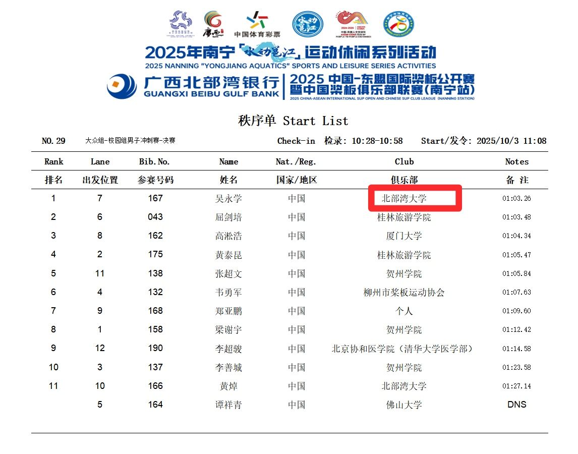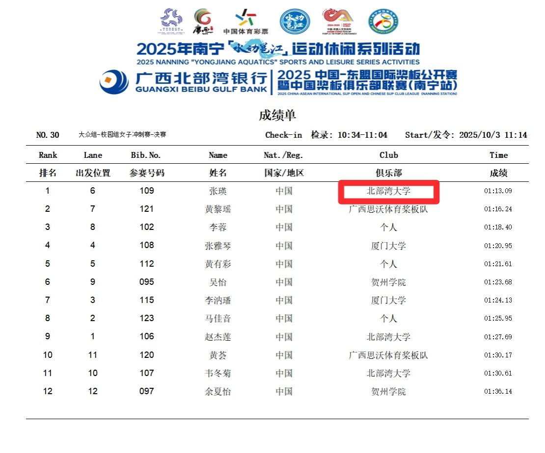 据悉,本次赛事由中国国家体育总局水上运动管理中心、广西壮族自治区体育局和南宁市人民政府共同主办,设置专业组、大众组、绿城组等多个组别,均为个人赛,小项分男子、女子200米竞速赛和3000米长距离竞速赛。bw必威西汉姆联官方网站桨板队奋勇争先、毫不示弱,在比赛中勇夺佳绩,于粼粼波光中展现了新时代大学生良好的竞技风采。