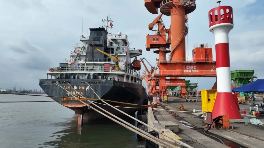 港口码头场景中,右上角为正在停泊的“新林海 1”号(XIN LIN HAI 1)船舶,