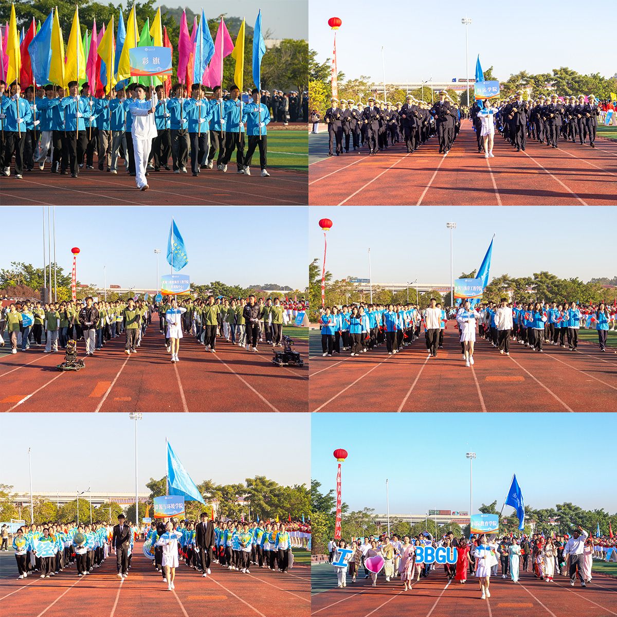 激昂的《运动员进行曲》迎接27支方队依次入场。国旗、校旗、会徽方队精神抖擞,鲜花队手执花球,彩旗队挥舞旗帜,活力四射点燃现场气氛;各学院方队步伐铿锵、口号响亮、创意纷呈,充分展现了湾大师生朝气蓬勃、斗志昂扬的精神风貌。