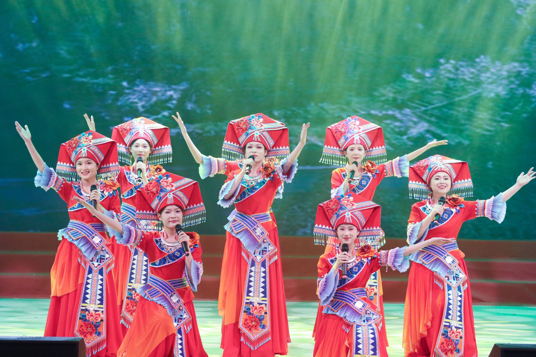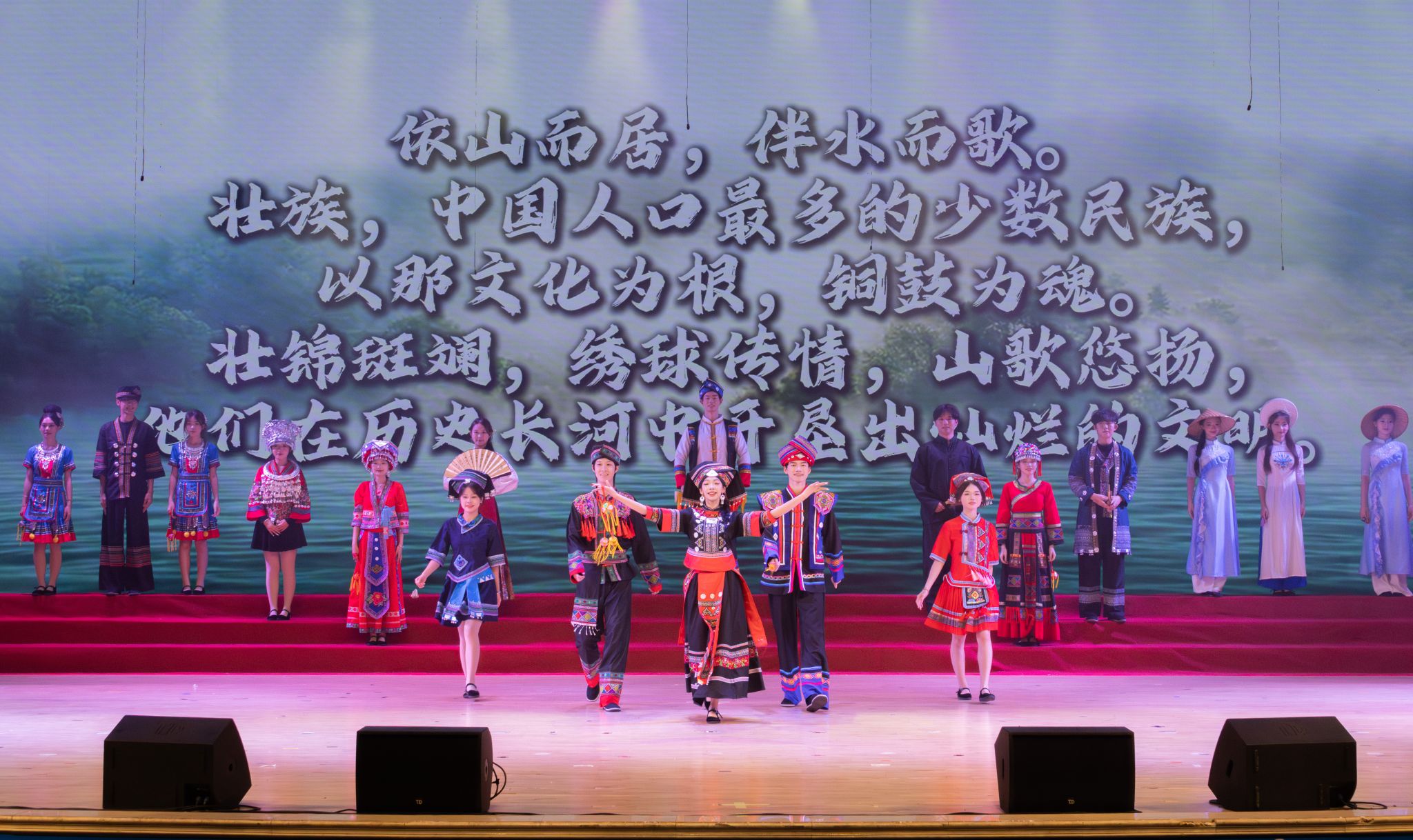 教师小组唱《外婆的澎湖湾》温情引入“千帆聚星河·共绘山海卷”篇章,熟悉的旋律唤起师生美好回忆。学生小组唱《挑着好日子山过山》节奏欢快,唱出师生奋发向上的精神风貌。舞蹈《游园》展现古典雅韵。歌曲《是妈妈是女儿》以温情对话触动人心,展现亲情的绵长力量。民族服饰走秀《山海灵》绚丽登场,生动呈现八桂大地多彩文化与和谐共生的美好画卷。