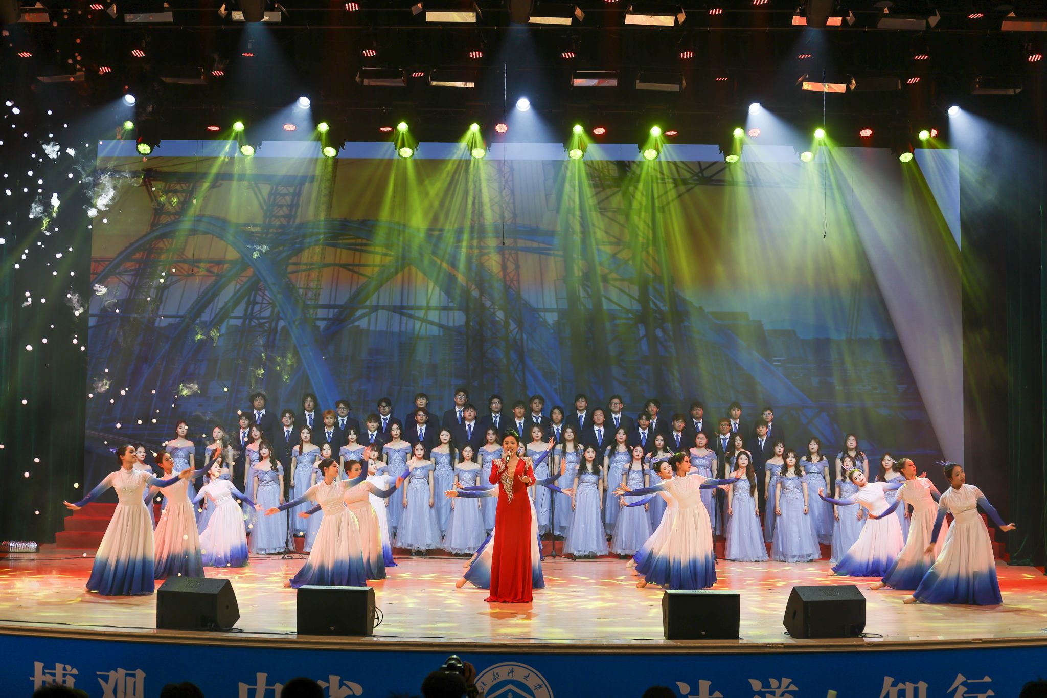 旗语操《青春奔赴》昂扬开启“旭日映运河·钦向新纪元”篇章,整齐有力的动作,展现青春奔赴新征程的豪情。小品《万松书院》以幽默方式演绎求学故事,传递严谨治学、师生情深的真谛。歌舞《相亲相爱》温暖热烈,凝聚起湾大人同心前行的深厚情谊。合唱歌舞《通江达海启新航》将盛典推向高潮,激昂的歌声与奔放的舞姿,讲述着学校服务区域经济社会高质量发展的奔赴与梦想,激励着学校师生乘平陆运河之势,在新时代的浪潮中同心同行、奋勇向前。