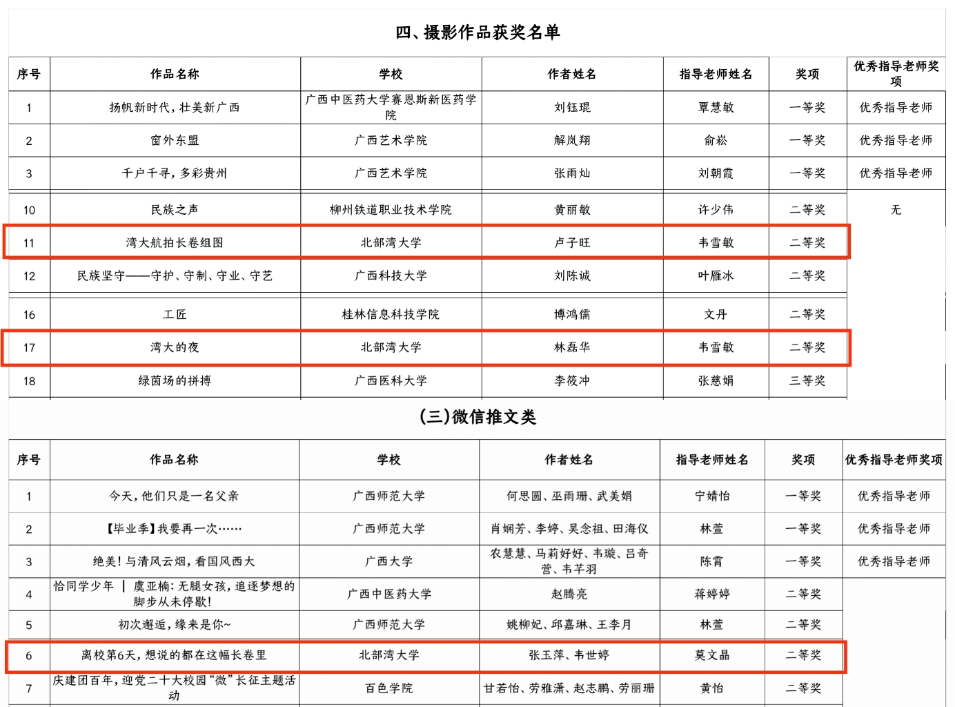 近日,由自治区教育厅会同自治区党委网信办组织开展的第八届全区大学生网络文化节和2022年全区高校网络教育优秀作品推选展示活动评选结果揭晓,必威西汉姆联选送的摄影作品《湾大航拍长卷组图》《湾大的夜》,微信推文作品《离校第6天,想说的都在这幅长卷里》均荣获二等奖。