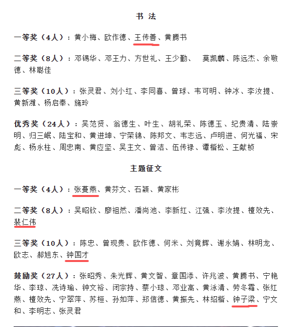 王传善老师的作品荣获书法一等奖;张蔓燕老师的《墨香里的银发影》获主题征文一等奖;裴仁伟老师的《教师,一个很难说“我没空”的职业》获主题征文二等奖;钟国才老师的《读习近平总书记给“银龄行动”老年志愿者回信有感》获主题征文三等奖;钟子梁老师的《平陆运河入海流》获主题征文优秀奖。退休教师声乐小组唱荣获“金秋好声音”优秀奖。