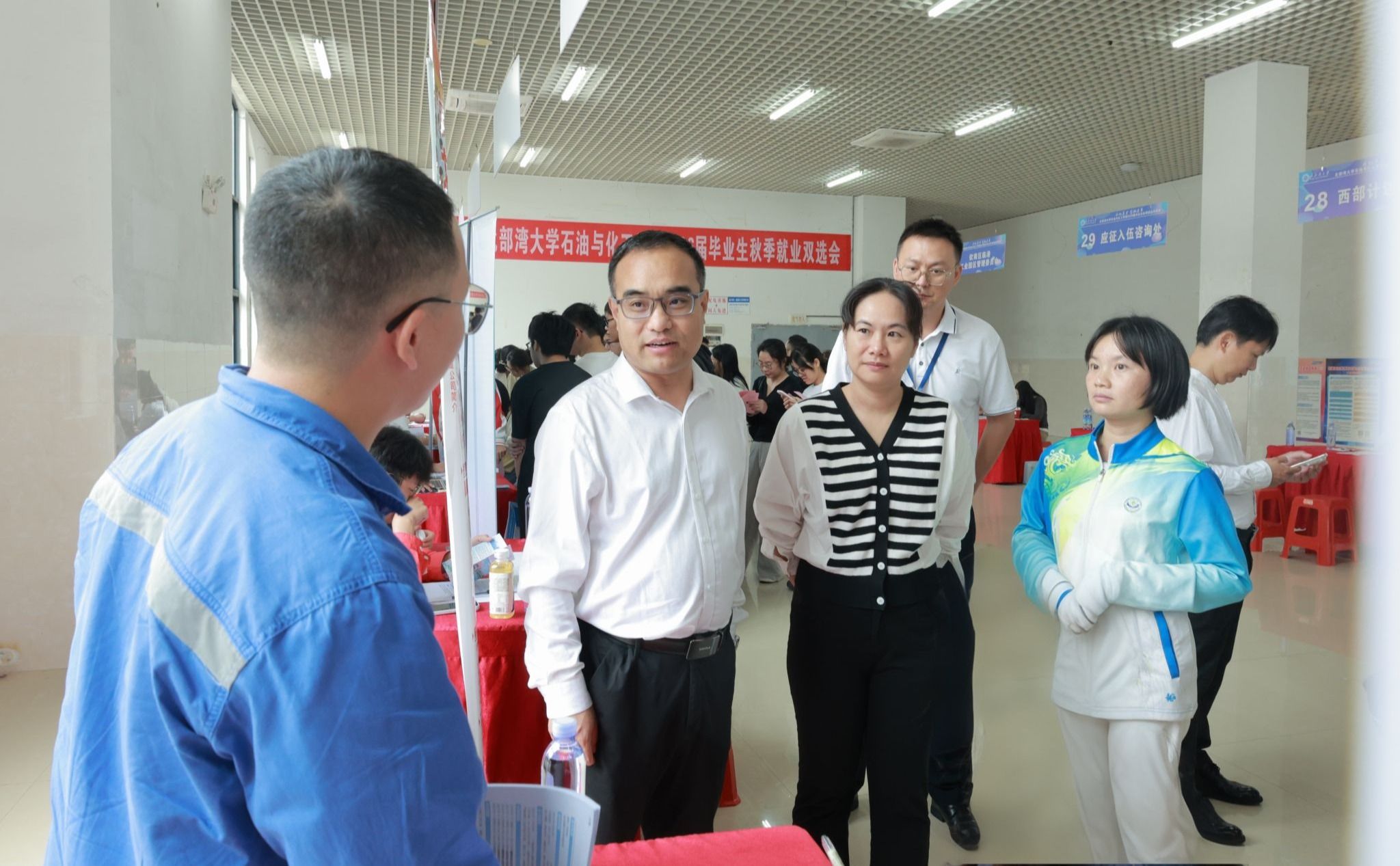 双选会现场气氛热烈、秩序井然。毕业生们手持精心准备的简历,满怀信心地与用人单位交流洽谈,展现出良好的精神风貌和积极的求职态度。校党委常委、副校长马秀明率领学生工作处及石油与化工学院领导班子亲临现场,与用人单位代表深入交流,详细了解人才需求和毕业生求职情况,认真听取用人单位对学校人才培养、专业建设、校企合作等方面的宝贵建议。