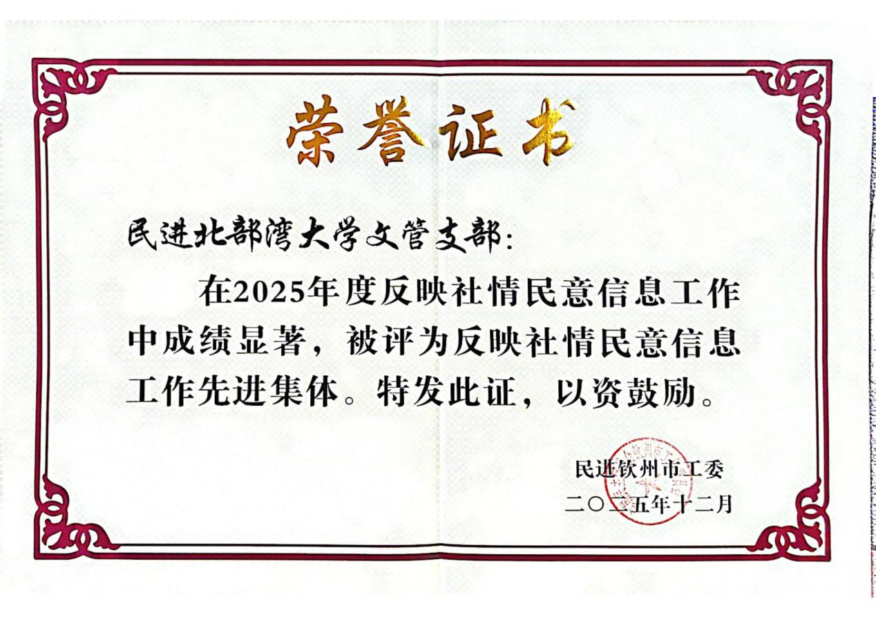 近日,民进钦州市工委发布《关于表彰2025年度先进集体和先进个人的决定》。民进bw必威西汉姆联官方网站文管支部荣获“反映社情民意信息工作先进集体”荣誉称号。黄志宇、王淑慧、谢桂兰等3名教师荣获参政议政工作先进个人荣誉称号;王淑慧、吴海萍、覃伟荣等3名获得“双岗建功”优秀会员荣誉称号;黄志宇还荣获反映社情民意信息工作先进个人荣誉称号。