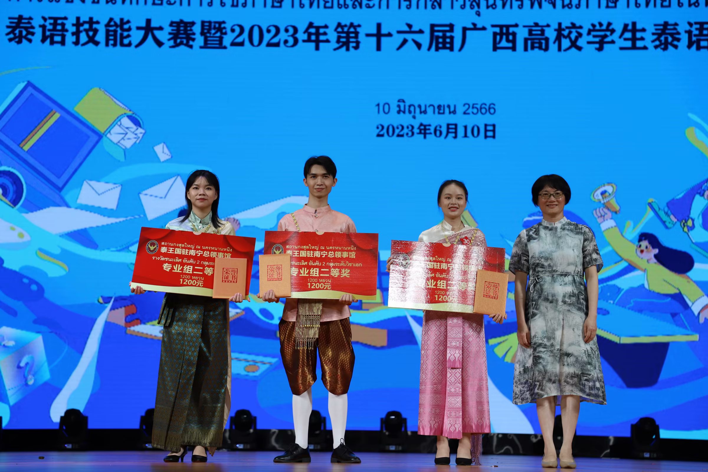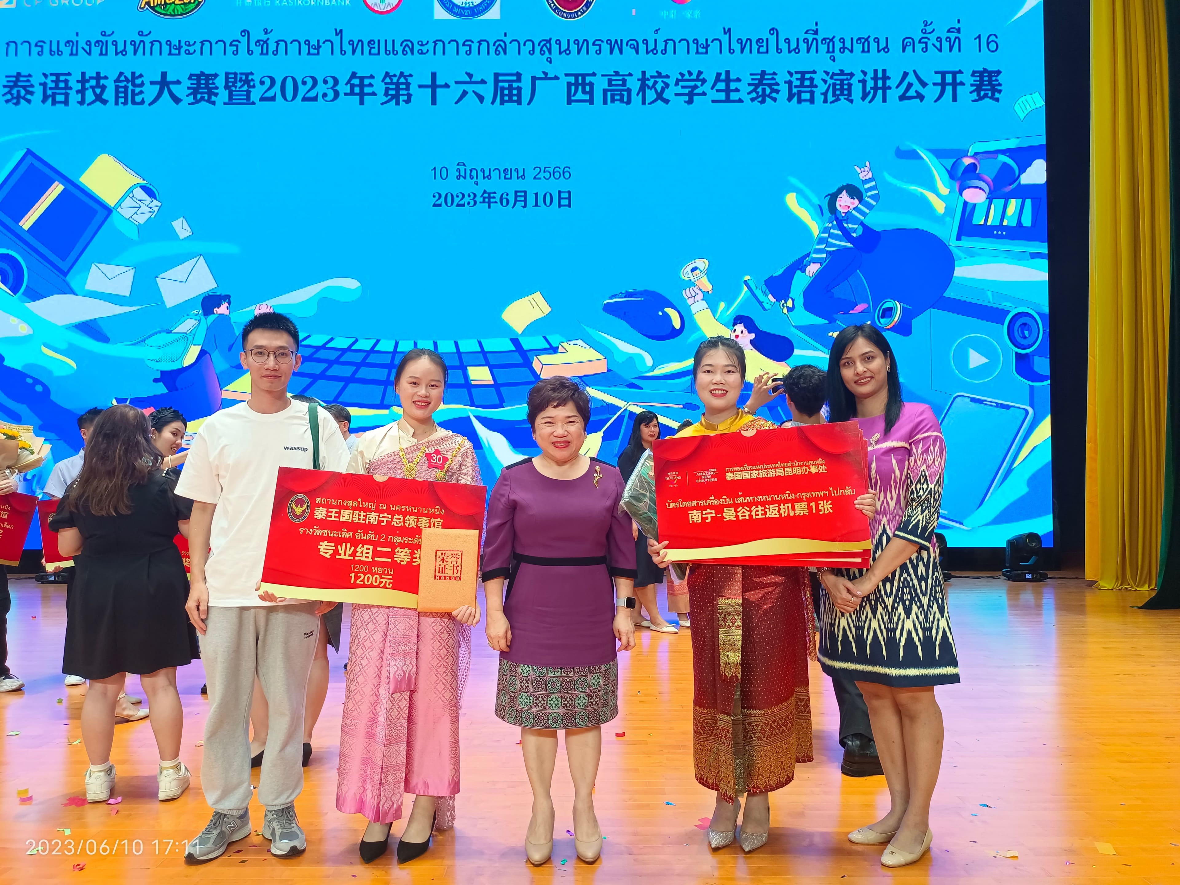 6月10日,由泰王国驻南宁总领事馆与广西民族大学联合主办的泰语技能大赛暨2023年第十六届广西高校学生泰语演讲公开赛在南宁举行。本次比赛共有广西区内19所高校的30名选手参加专业组比赛,18支参赛队伍参加非专业组比赛。必威西汉姆联泰语专业在本次大赛中喜获佳绩,刷新了必威西汉姆联泰语本科专业创办以来参加该赛事的最佳成绩。