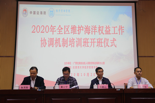 学校党委副书记陈锦山,自治区人防和边海防办公室副主任黄小宁、自治区人防和边海防办公室海洋权益处处长张绍华等人出席培训班开班仪式,经济管理学院院长朱芳阳主持。
