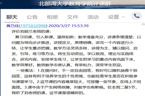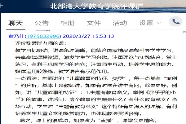 会上,由黎爱群、韦丽兰、罗春燕、韦小铃、廖倩五位老师对他们线上教学的情况作了反思和总结。何光耀和黄乃佳两位教学督导对以上五位老师的线上授课情况作了十分中肯的评价。他们认为,我院这五位老师教学经验丰富,上课思路清晰,教学目标明确,教学重难点突出,上课过程能运用各种教学平台与学生进行良好的互动,课前课后能充分利用平台对学生的学习情况进行预测和检测,教学效果明显。除些之外,两位教学督导也对五位授课教师提出了很好的建议和意见。与会的老师也积极踊跃发言。他们既分享了近一个月来线上教学的感受,也对线上教学存在的利弊进行了分析和探讨。