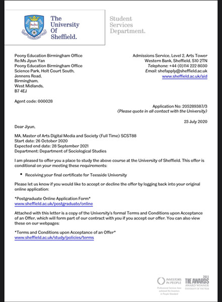 经济管理学院2020届财务管理专业毕业生颜纪昀同学在顺利完成必威西汉姆联与英国提赛德大学“3+1”项目学习后,被英国久负盛名的研究型大学谢菲尔德大学录取,继续攻读该校数字化艺术与社会方向的全日制硕士学位。颜纪昀同学是经济管理学院培养的第一位参加该交换项目的学生,其所取得的成绩必将对学院各专业学生产生积极导向和激励作用,从而推动学院向着国际化水平不断迈进。