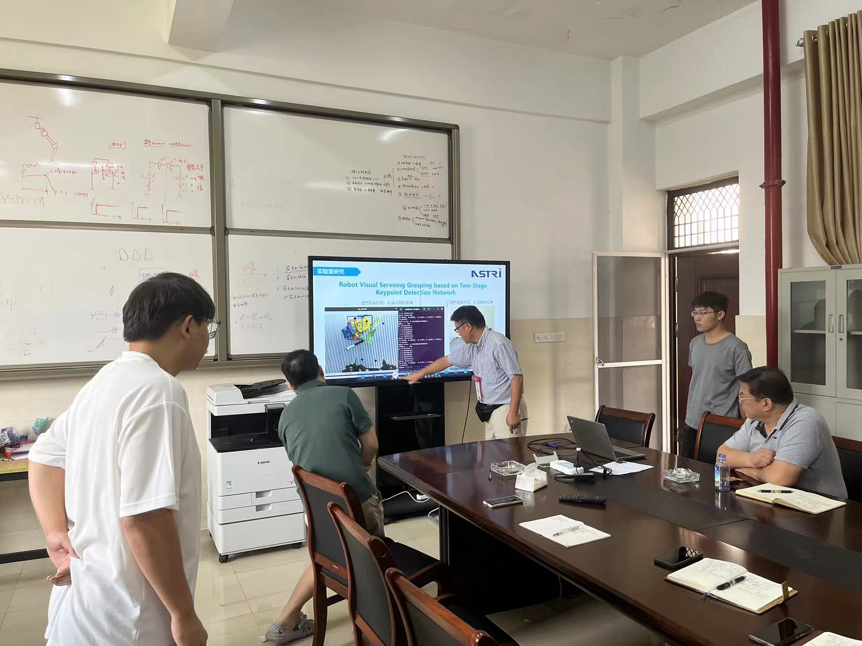 8月11日暑期第六次组会:老师提醒各位在校同学注意身体,并让三位博士生协助即将到来的张善俊教授进行学习和调研。视觉伺服小组学生汇报关于使用极坐标的基于图像的视觉伺服,以及让机器人学习人类手的快速抓取技能的相关内容。