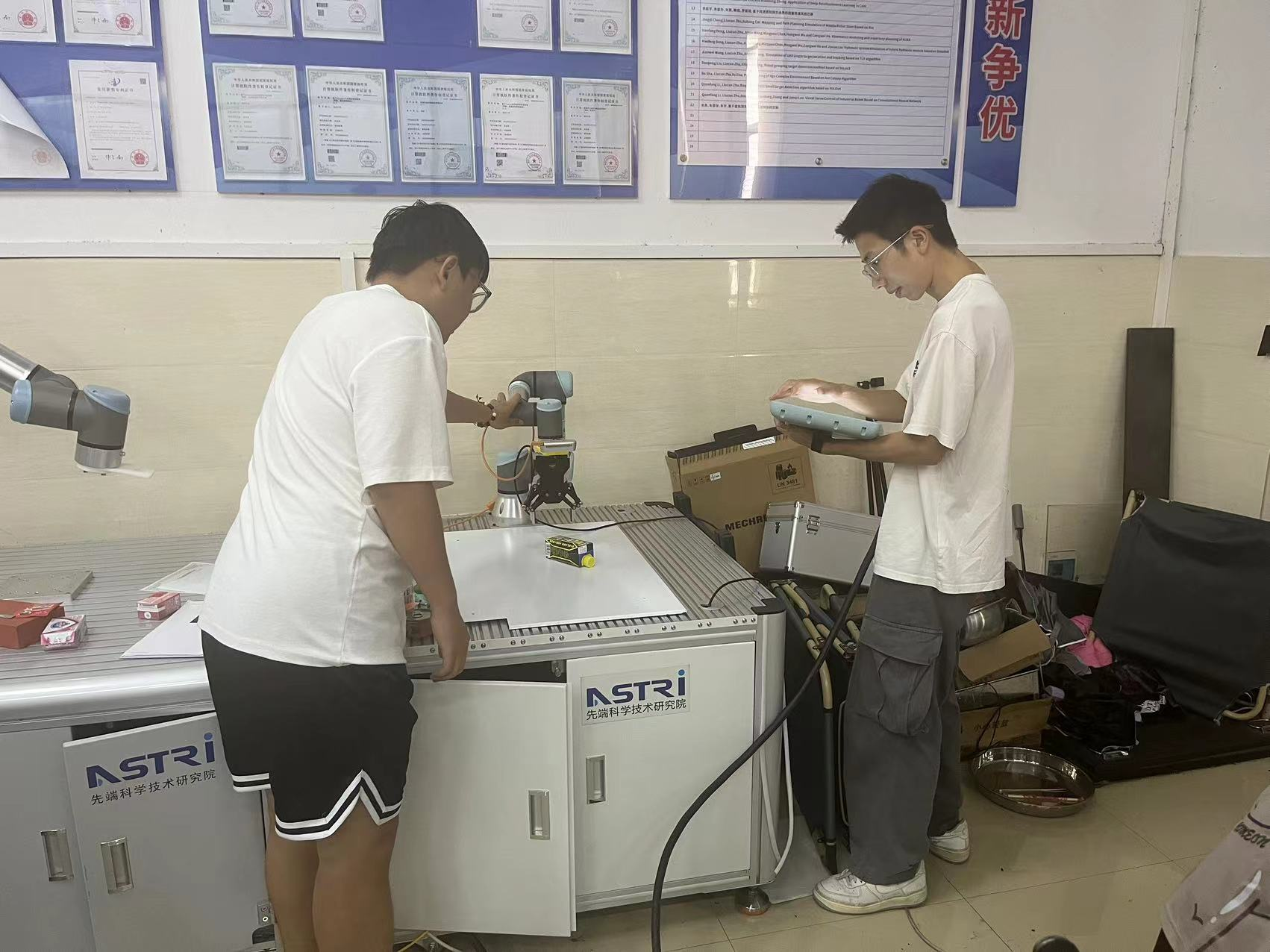机械方向的2022级硕士白文豪和李亮在进行ur3机械臂实验。