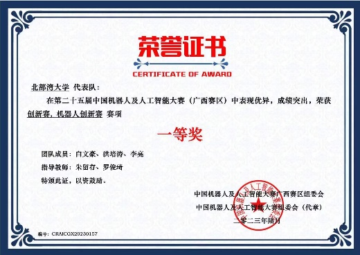 中国机器人及人工智能大赛是一项历史悠久、影响广泛的全国性学科竞赛。作为中国人工智能学会最早主办的竞赛之一,大赛已为我国培养了大量“能动手”、“敢创新”、“善协作”的复合型人才。大赛已列入中国高等教育学会发布的《2020年全国普通高等学校学科竞赛排行榜》《2021年全国普通高校大学生竞赛分析报告》。在第二十四届中国机器人及人工智能大赛(广西赛区)中,由先端科学技术研究院朱留存、罗俊琦、赵成龙等老师带领,获国家二等奖1项,省级一等奖2项,省级二等奖1项,省级三等奖2项。在朱留存、罗俊琦老师指导下,刘纪元、张振宇、经展鹏研究生团队作品“空气哨兵——低成本全时空PM2.5监测系统”获国家级(人工智能创新赛)二等奖,充分展现了必威西汉姆联在机器人及人工智能相关领域的人才培养质量。