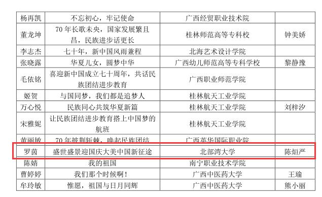 近日,根据桂教民教[2019]11号文件《自治区教育厅关于公布“喜迎新中国成立70周年 共话民族团结进步教育”征文活动评选结果的通知》获知,由党委宣传部邓波老师指导廖新宇创作的作品《东风绕》荣获高校组二等奖;党委宣传部陈烜严老师指导罗茵创作的作品《盛世盛景迎国庆大美中国新征途》荣获高校组三等奖。