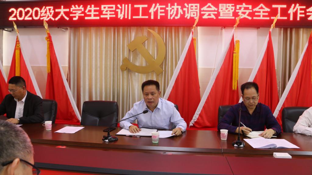 11月25日下午,学校在行政楼501会议室召开2020级大学生军训工作协调会暨安全工作会议,学校党委委员、副校长曾彦出席会议并讲话,校党委武装部部长陈达兴主持。