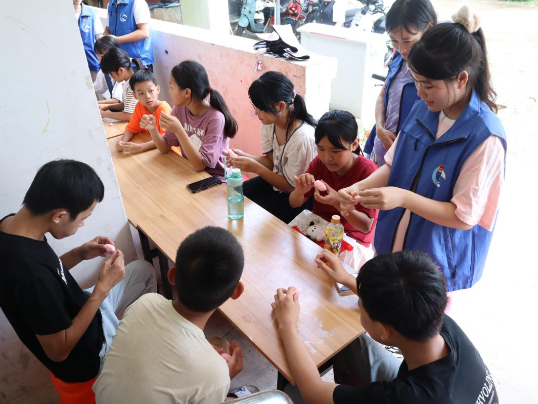 服务团成员和三宣堂工作人员带领小朋友做手工