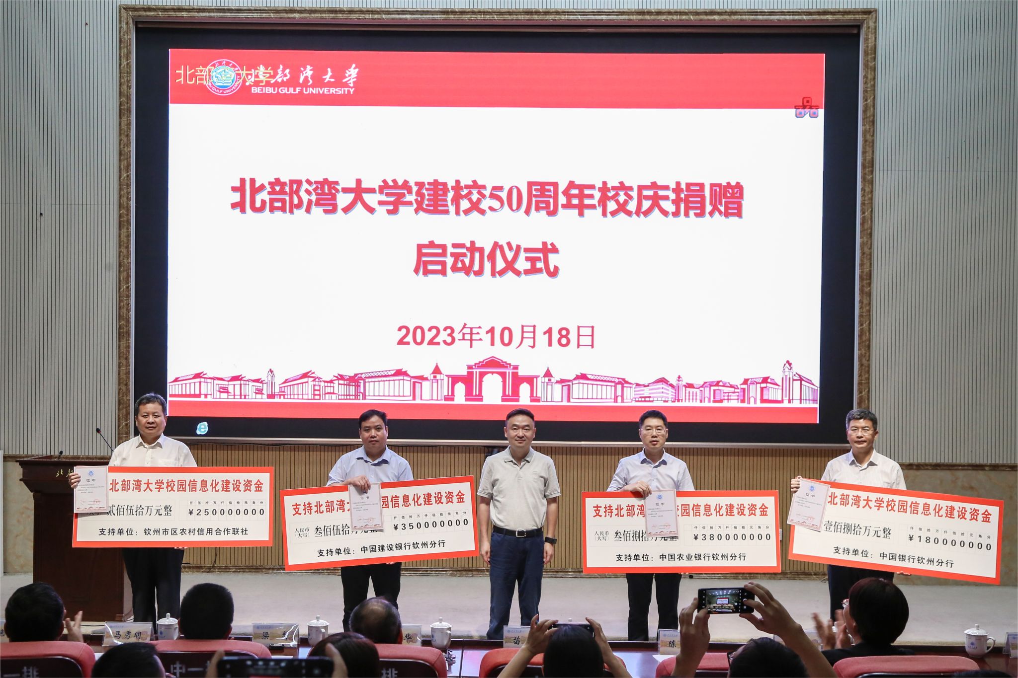 捐赠启动仪式上,校友梁海明、胡忠旗、刘浩彰、黄海东、江世区、王春兰,玉林市校友之家、广西华侨爱心基金会、钦州海博出租车公司大学城车队、苏世建设管理集团有限公司广西钦州分公司,以及学校部分教职工代表共计捐赠现金约160万元人民币;校友沈祖连捐建小小说文学馆一座;合作企业中国农业银行钦州分行、中国建设银行钦州分行、中国银行钦州分行、钦州市区农村信用合作联社、广西新华书店集团传文大中专教材公司等爱心企业共支持学校信息化建设和改善办学条件建设经费1192.8万元;长江航道局西部陆海新通道(平陆)运河航道工程施工№.HD13标段项目经理部、长江航道局西部陆海新通道(平陆)运河航道工程施工№.HD14标段项目部、鄢陵县铭盛工程机械租赁有限公司等捐赠各种树木621棵。