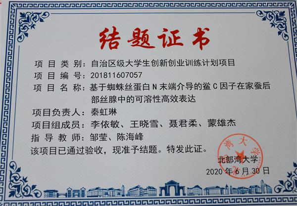4.2020年自治区级大学生创新创业计划训练项目“基于蜘蛛丝蛋白N末端介导的鲎C因子在家蚕后部丝腺中的可溶性高效表达”获得结题证书。