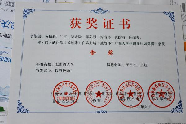 1.第九届“挑战杯”广西大学生创业计划竞赛作品《鲎丝缘》荣获区级金奖;