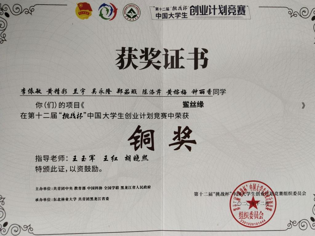 2.第十二届“挑战杯”中国大学生创业计划竞赛作品《鲎丝缘》荣获国家级铜奖;