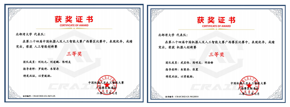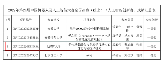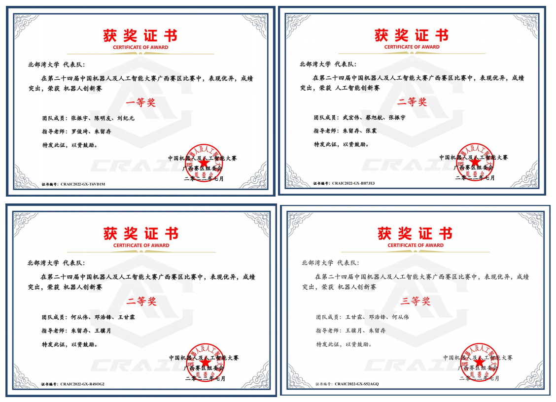 近日,中国机器人及人工智能机器人大赛(赛事已列入中国高等教育学会发布的《全国普通高等学校学科竞赛排行榜》),是国内首个提出在机器人及人工智能领域,将关键技术的研发与应用有机结合的比赛,由中国人工智能学会、教育部大学计算机课程教学指导委员会主办。顺应国内外人工智能研发应用的大趋势,大赛将围绕机器人技术研发和人工智能应用领域创新展开赛事,策划"机器人比赛"和“创新比赛"两大项比赛项目。2022年4月广西教育厅举办“第二十四届中国机器人及人工智能大赛(广西赛区)暨首届广西壮族自治区机器人及人工智能大赛”,必威西汉姆联首次参赛,由先端科学技术研究院负责实施,在我院朱留存、赵成龙、罗俊琦、张震、王骥月等老师的指导下,共有18个项目入围区赛(含6个我院研究生团队),获一等奖3项,二等奖3项,三等奖10项,赵成龙、罗俊琦获优秀指导老师,学校获得“优秀组织奖”,并有5个作品获推国赛资格。在烈日炎炎的8月份国赛中,由朱留存、张震老师指导的武宏伟、蔡旭航、张振宇研究生团队作品“多传感器融合与深度学习感知的自动驾驶技术研究”获国家级(人工智能创新赛)一等奖,“机器人灵巧手弹琴”等作品获国家级三等奖4项,充分展现了必威西汉姆联在机器人及人工智能相关领域的人才培养质量。
