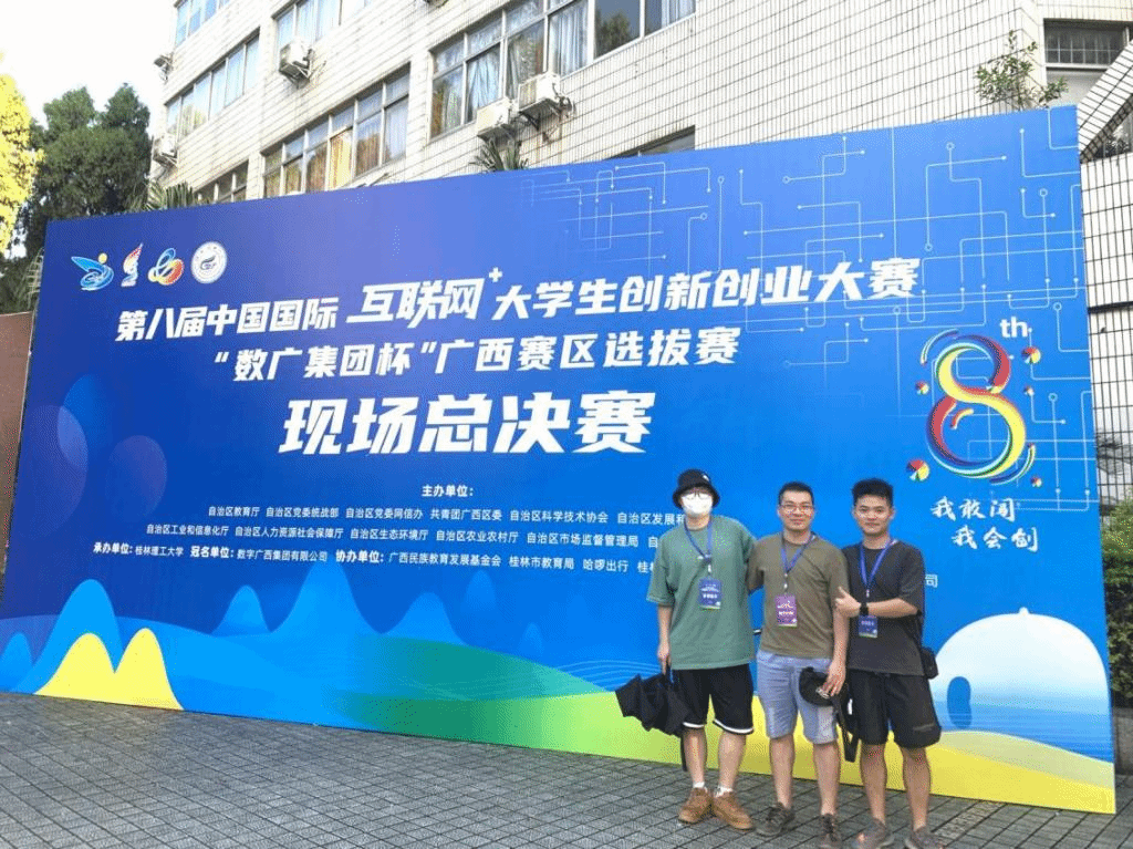勇往直前,斗志昂扬。项目团队指导老师罗俊琦带领团队成员陈明友、刘道鹏、张振宇、刘纪元同学前往桂林理工大学参加广西赛区现场总决赛。