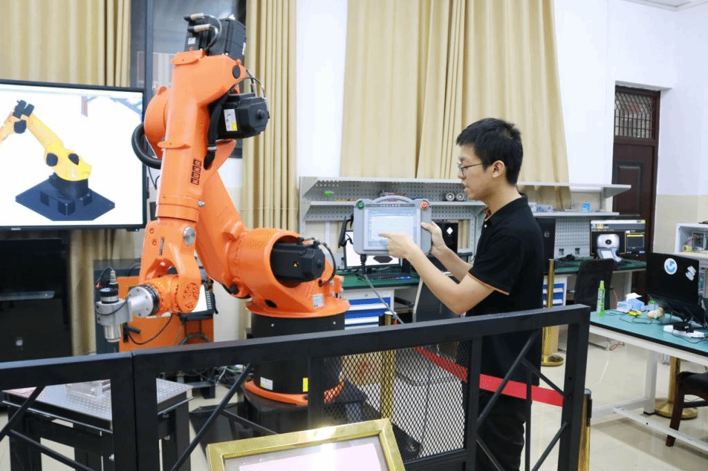 2020级机械方向的硕士邓浩锋正在向大家展示这样的大家伙——由KUKAkr60机械臂搭建起来的数字孪生实验平台,通过机械臂与软件模拟仿真平台的同步运行,我们看到了虚拟与现实的融合与碰撞,也看到了机械的魅力。