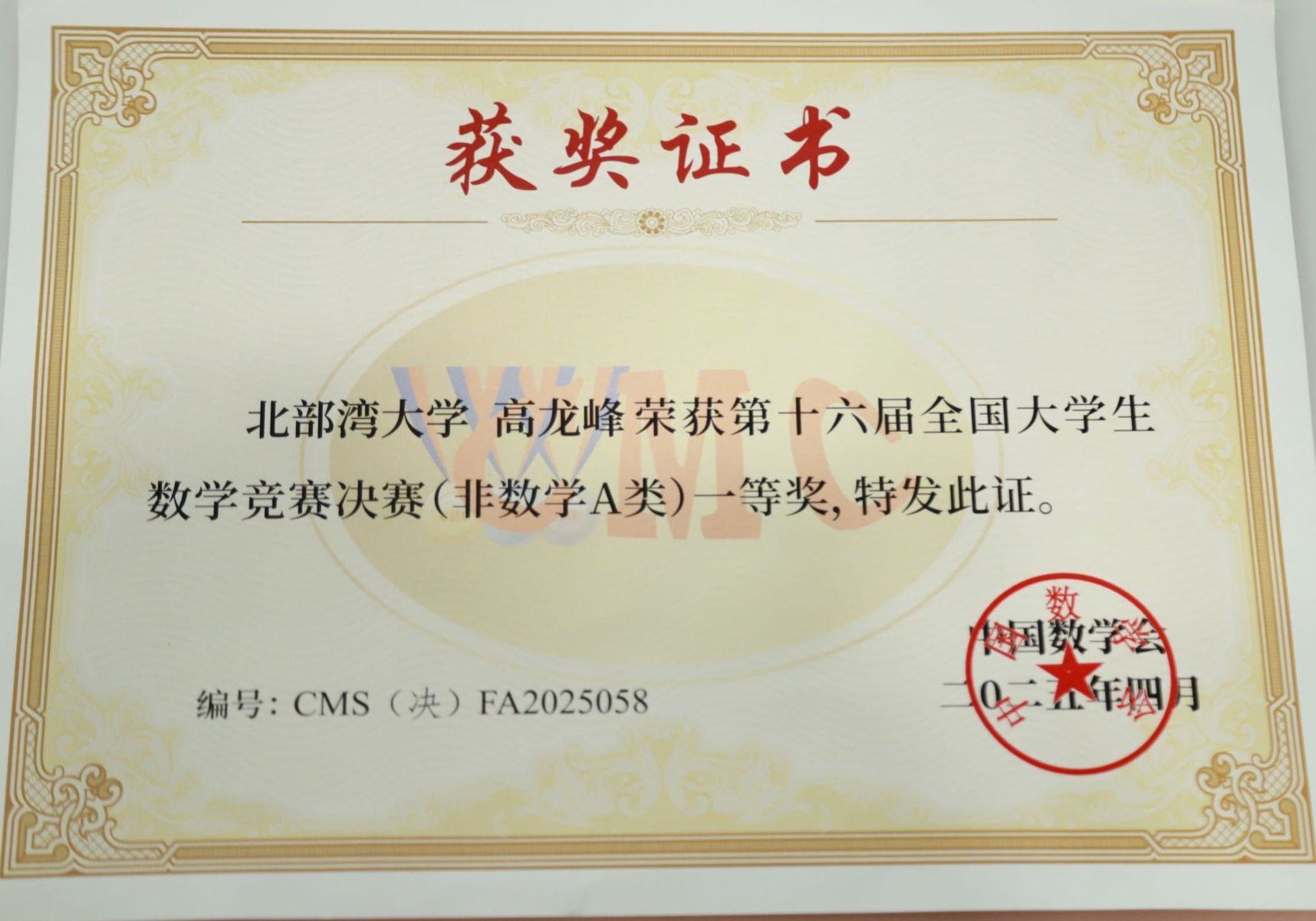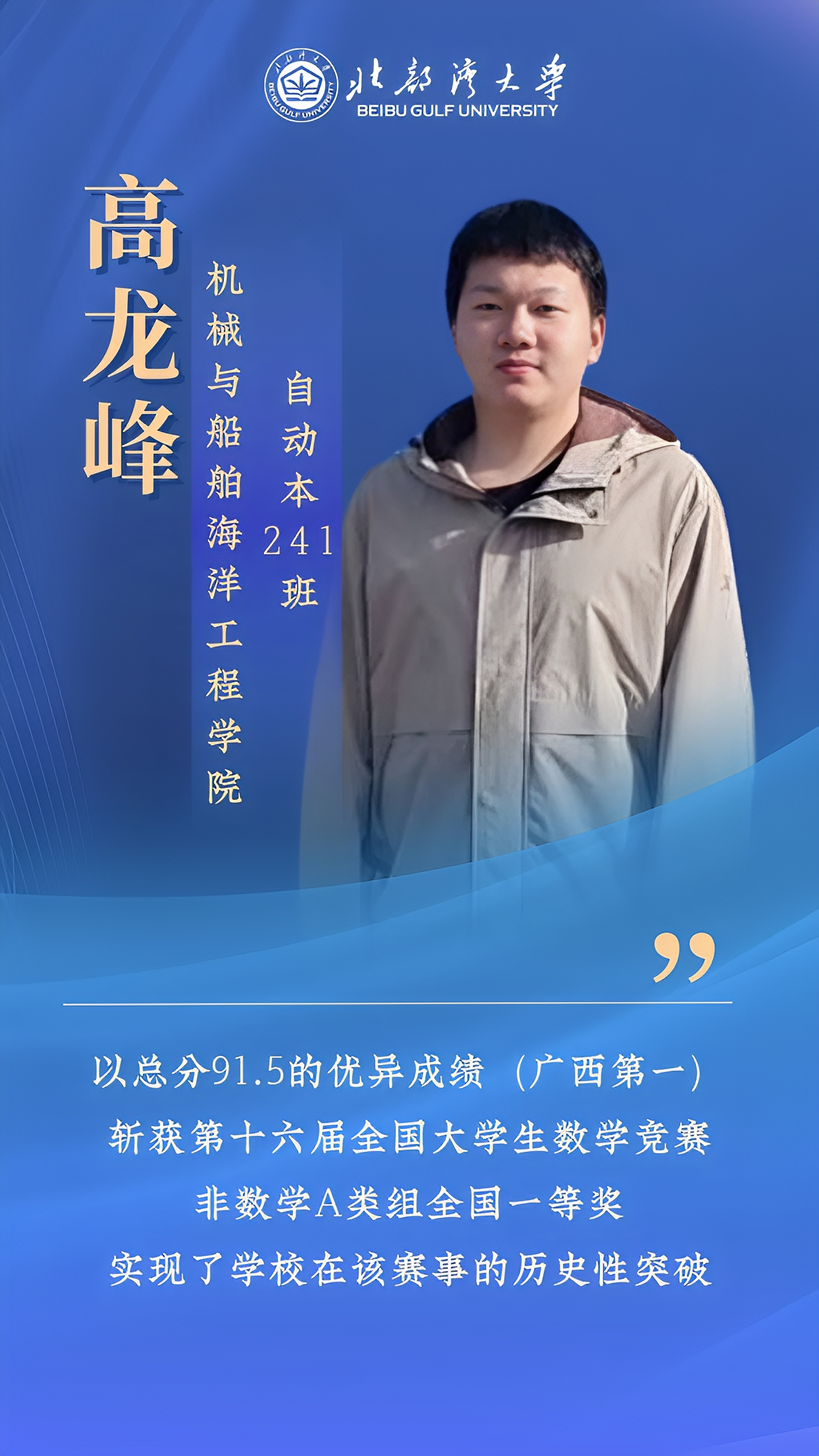 2025年4月,喜报从浙江师范大学举办的第十六届全国大学生数学竞赛决赛现场传来,必威西汉姆联机械与船舶海洋工程学院自动化专业241班高龙峰同学以总分广西第一的优异成绩斩获非数学A类组全国一等奖。这刷新了必威西汉姆联在该项赛事中的最佳纪录,让这位数学爱好者走进了我们的视野。