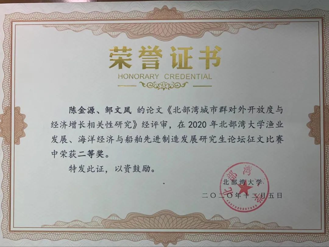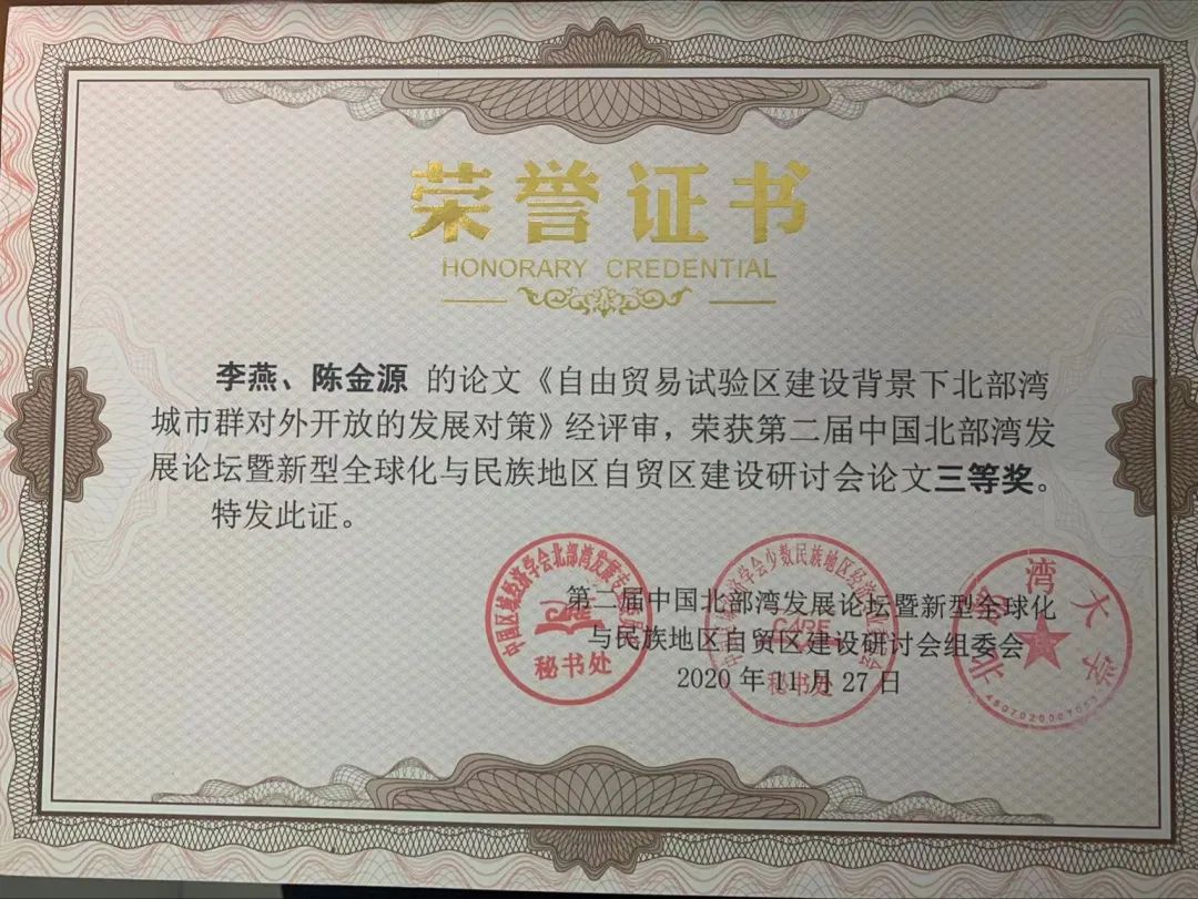 论文获第二届北部湾发展论坛暨新型全球化与民族地区自贸区建设研讨会三等奖