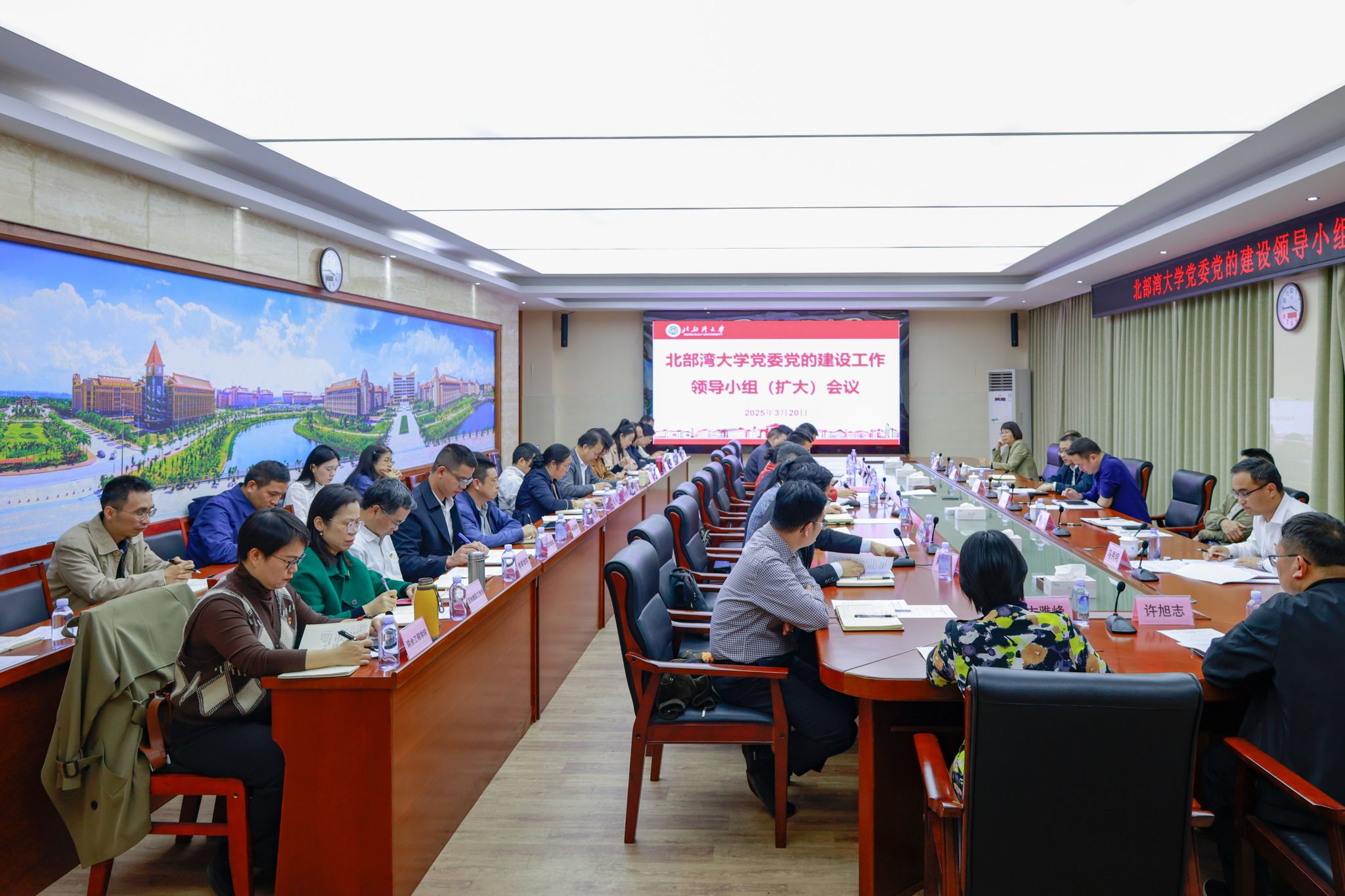学校党委党的建设工作领导小组全体在钦成员参加会议。校长助理、学校纪委副书记、二层机构党组织书记及相关职能部门负责人列席。(陈宇健 李兴宸 摄)