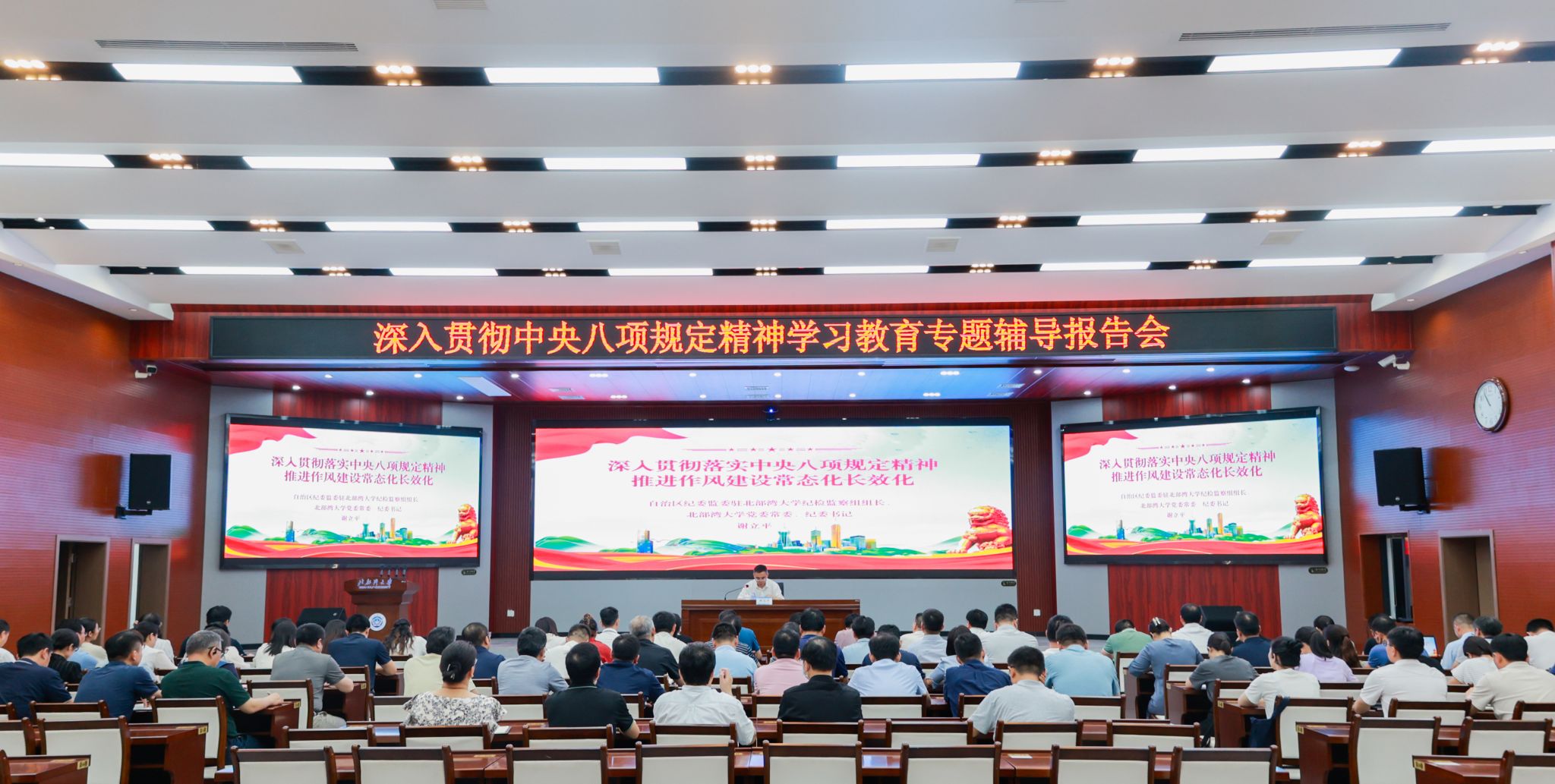 5月9日,学校在办公楼一楼报告厅举办深入贯彻中央八项规定精神学习教育专题辅导报告会。自治区纪委监委驻bw必威西汉姆联官方网站纪检监察组组长、校党委常委、纪委书记谢立平作专题辅导报告。学校全体中层领导干部参加会议。